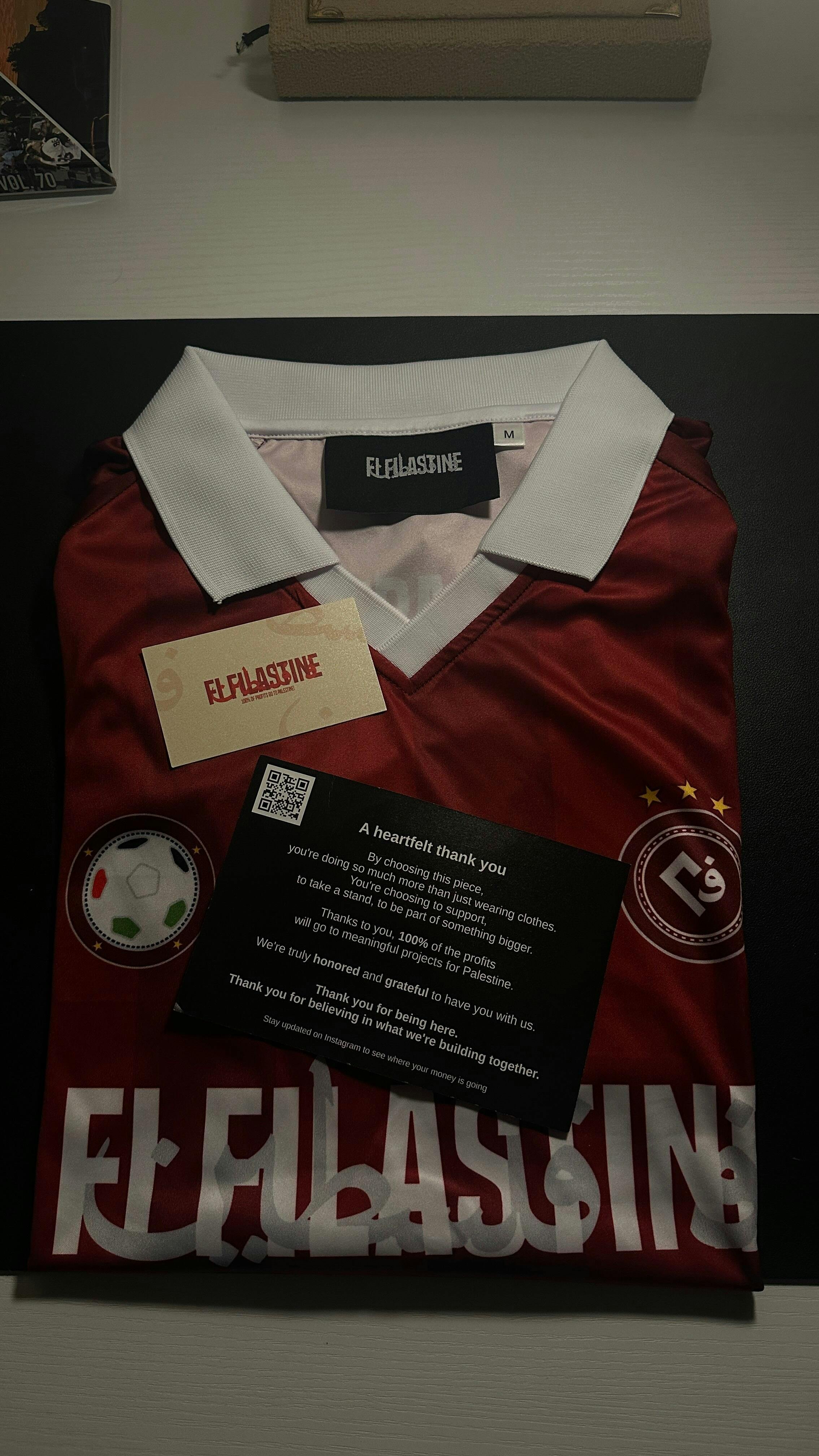 The FI FILASTINE Jersey in deep burgundy is a tribute to heritage, pride, and resistance. Inspired by iconic football kits from the 80s and 90s, it blends retro style with bold symbolism. Every stitch speaks for Palestine.